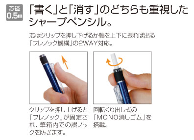 ●振れば芯が出るフレノック機構+MONO消しゴムを搭載。回転くり出し式の「MONO消しゴム」を搭載。
