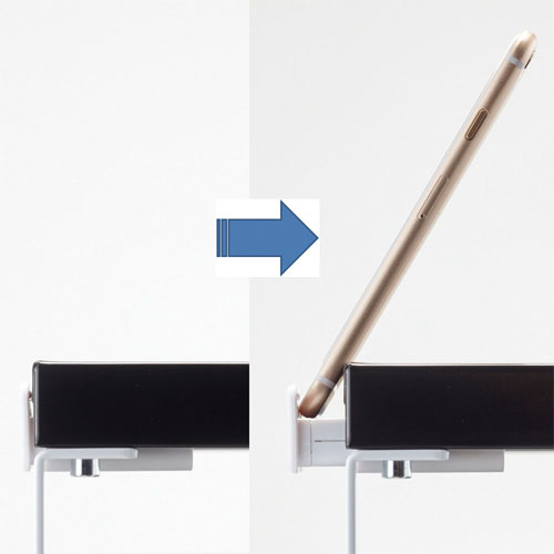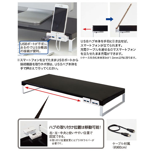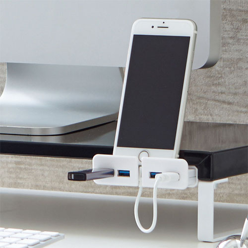 ●スマホの充電も手元で簡単。USB3.0のハブ付き机上台。取り付け位置は自由に変えられます。(※プラスドライバーが必要です。)USBハブ本体を手前に引き出せば、スマホを立てたまま充電が可能。(※厚み13mm以内。)