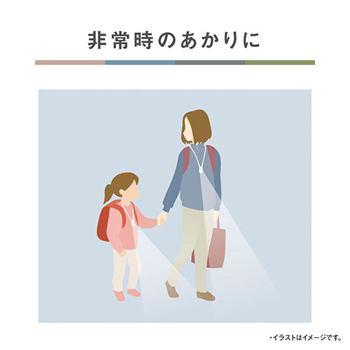 ●首にかけて両手を自由に使える快適・軽量なライト。白色LEDが手元・足元を明るく照らします。小雨の中でも使える防滴構造です。